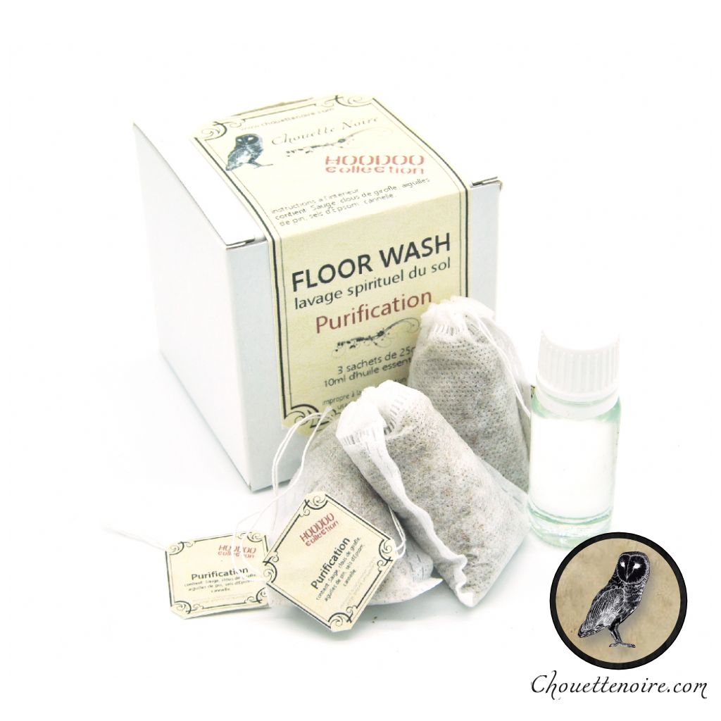 Faites bouillir dans une petite casserole un demi-litre d'eau. Lorsque l'eau bout, plongez-y un sachet de Floor Wash et laissez frémir à petit feu pendant vingt minutes. Une fois passé ce délai, coupez la source de chaleur et laissez refroidir le liquide en y laissant le sachet. Lorsque la décoction sera revenue à température ambiante, retirez le sachet et ajoutez le tiers du contenu de la fiole d'huiles essentielles (environ 25 gouttes). Mélangez bien, puis versez le Floor Wash dans un seau d'eau tiède. Mélangez une nouvelle fois. Vous pouvez commencer votre lavage spirituel.